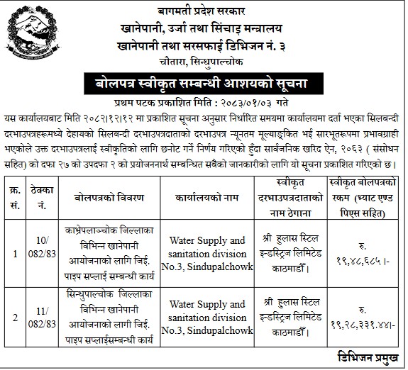 बोलपत्र स्वीकृत सम्बन्धी आशयको सूचना